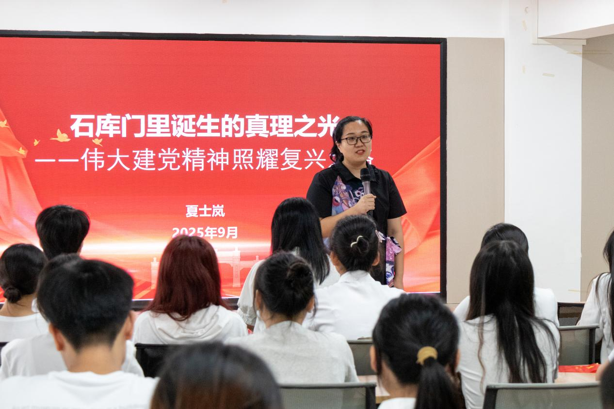党委副书记夏士岚以《石库门里诞生的真理之光》为题,带领师生一同回到1921年7月的上海,重温伟大的建党精神。她从中共一大13位代表的人生轨迹切入,生动讲述了他们在不同历史节点上的抉择与结局,展现了信仰的艰难与珍贵,深刻阐释了真理力量在中国革命历程中的奠基作用。她强调,信仰不是轻易得来的,而是在血与火的考验中锤炼而成。新时代青年应以史为鉴,端正入党动机,杜绝侥幸与功利,始终以对党绝对忠诚为根本,以实际行动践行初心使命。