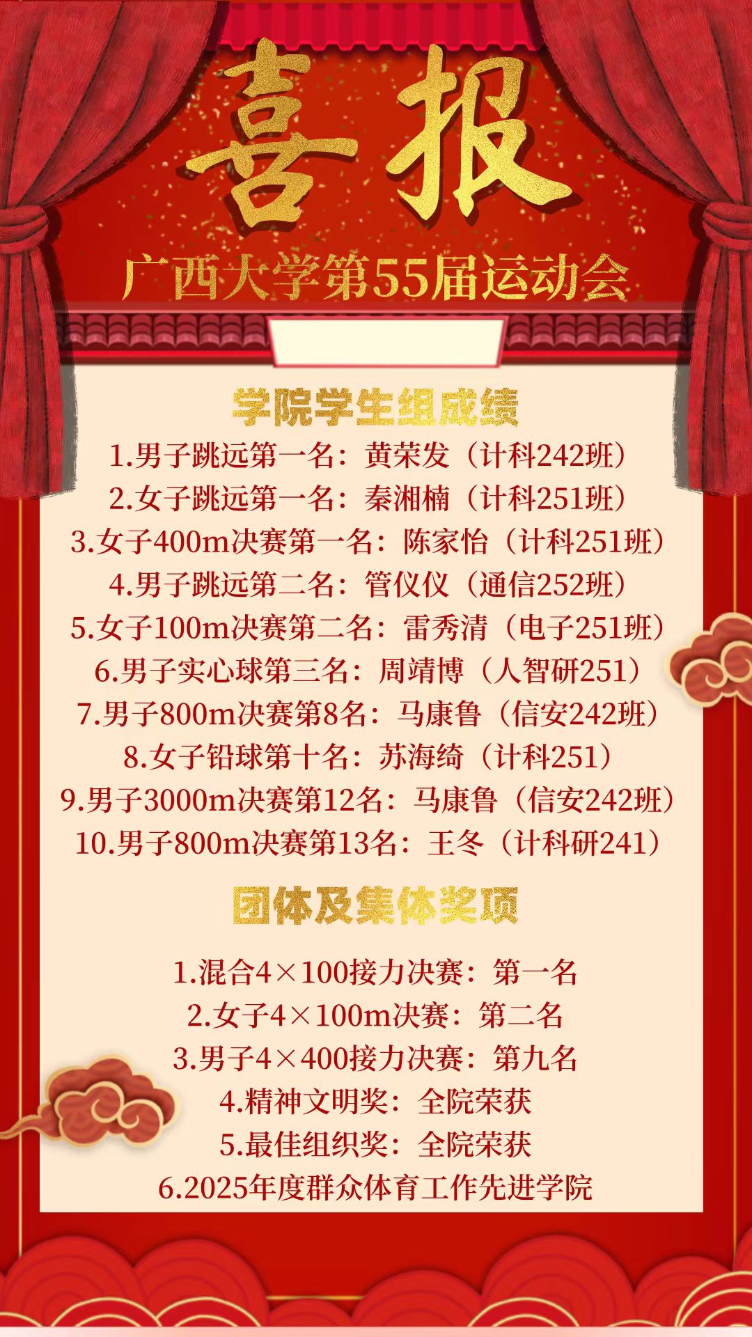 所有的拼搏与汗水,共同写就了这份沉甸甸的成绩单。它不仅记录了闪亮的奖牌与名次,更见证了每一位计电学子的团结、奉献与拼搏。