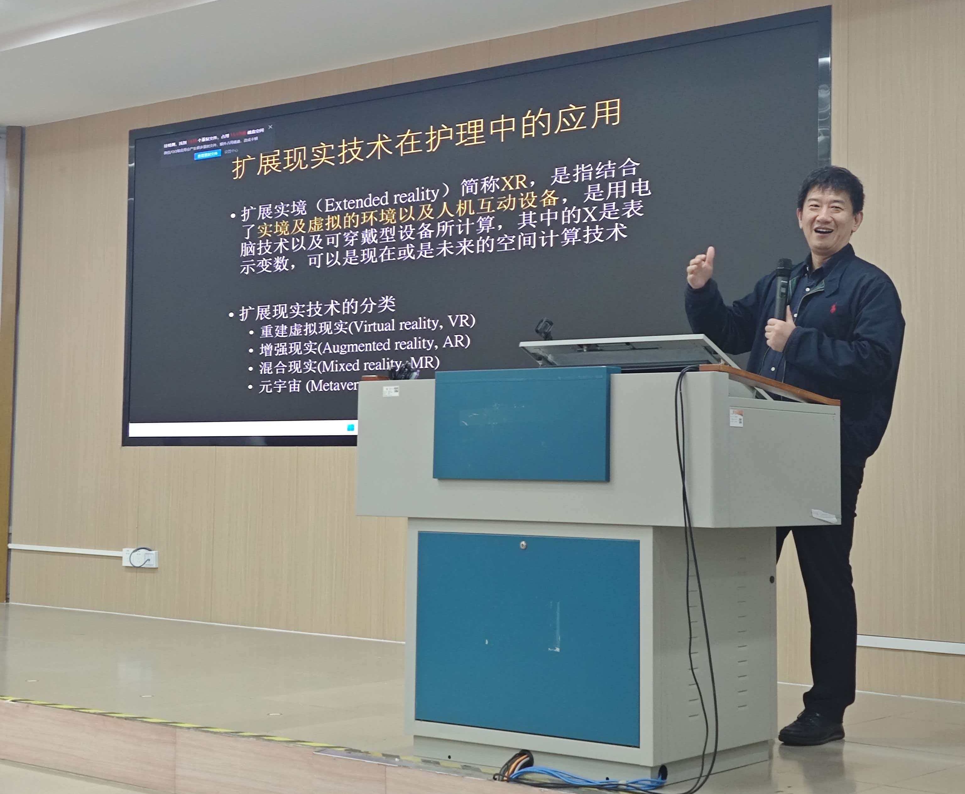 报告中,秦璟教授重点介绍了利用沉浸式虚拟现实环境,辅助失去行走能力的患者进行康复训练,帮助其逐步重建行走功能;同时,他还分享了通过虚拟现实交互场景对儿童多动症进行行为干预的研究进展,包括通过播放舒缓、优美的自然风景画面,改善儿童及其家长的情绪状态,从而提升干预效果。此外,秦璟教授还展示了通过虚拟现实技术呈现吞咽相关视觉刺激,辅助吞咽功能障碍患者完成吞咽训练的创新方法,引发了在场师生的浓厚兴趣与热烈讨论。