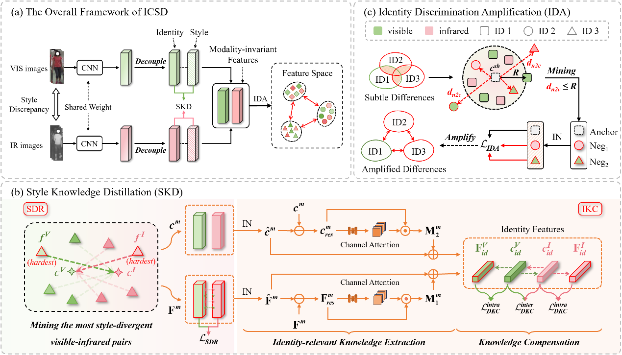 近日,我校小妲己直播app 凌永国老师与其指导的2023级硕士研究生胡子豪等合作的学术论文《Identity-Compensated Style Distillation for Visible-Infrared Person Re-Identification》成功被国际图像处理顶级期刊《IEEE Transactions on Image Processing》(IEEE TIP)录用。广西大学为论文的第一署名单位,合作单位包括特伦托大学、合肥工业大学和南洋理工大学。 IEEE TIP是国际电气工程师协会(IEEE)下图像处理领域的顶级期刊,是中国科小妲己app SCI 一区 TOP 期刊、中国计算机学会 CCF 推荐的计算机图形学与多媒体领域的三大 A 类期刊之一,2024-2025年最新影响因子为 13.7。 可见光-红外行人重识别(Visible-Infrared Person Re-Identification, VI-ReID)是计算机视觉与智能安防领域的关键研究方向,旨在实现可见光与红外跨模态下的行人目标精准匹配。近年来,基于模态对齐与风格学习的重识别方法取得明显进展,但由于模态差异大、身份语义易丢失、细粒度特征难捕捉,现有方法在模态风格对齐与身份特征判别能力方面仍存在不足,跨模态检索精度难以进一步提升。针对上述问题,团队提出了一种全新的身份补偿式风格蒸馏(ICSD)框架,采用“对齐-补偿-增强”的范式。该方法通过风格知识蒸馏模块(SKD)实现模态风格对齐与身份语义补偿,并结合身份判别增强模块(IDA)强化细粒度身份差异,在缩小跨模态鸿沟的同时最大化保留判别性特征。实验结果表明,ICSD 在 SYSU-MM01、RegDB、LLCM 三大主流数据集上均能实现更稳定、更精准的跨模态检索,性能显著优于当前主流方法。 本研究获国家自然科学基金、广西自然科学基金等多个项目支持。 论文链接://ieeexplore-ieee-org-s.vpn.xdjapp.net:8118/document/11435248 一审一校:刘金辉、黄千芊 二审二校:蒙祖强 三审三校:赵进创