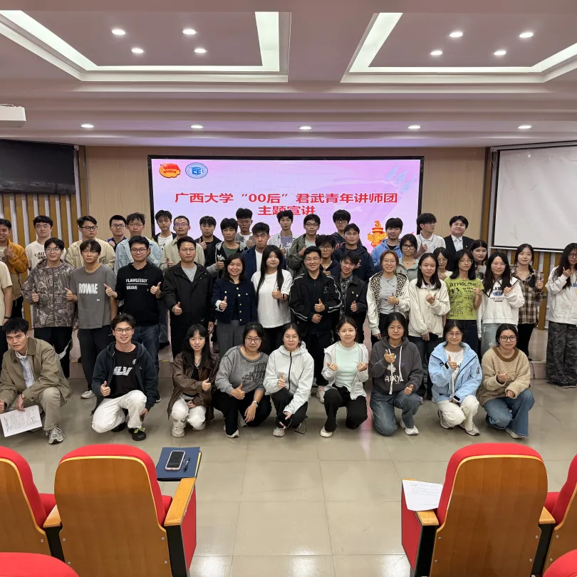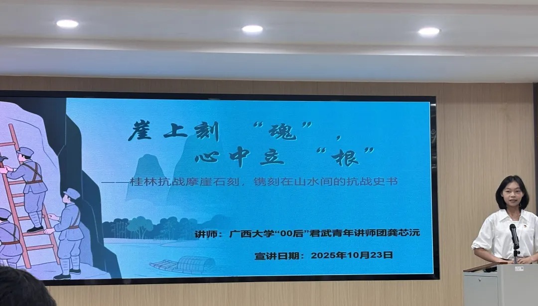 在主题宣讲环节中,来自广西大学“00 后”君武青年讲师团龚芯沅同学以《崖上刻 “魂”,心中立“根”》为题,为现场师生带来了一场生动而深刻的思政宣讲。